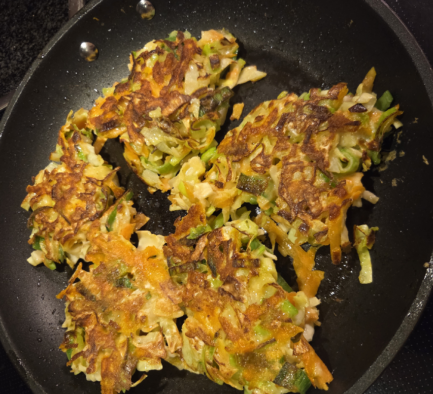 - Steg okonmiyakien som små bøffer på en pande ved mellem varme. 4-5 minutter på hver side.